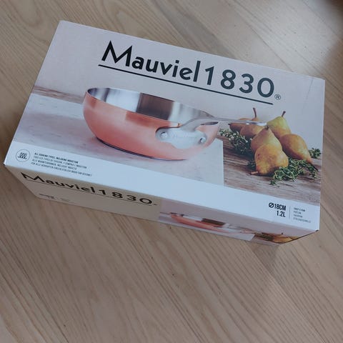 Mauviel 1830 stegepande med en diameter på 24 cm. Panden er udført i kobber med indvendig belægning i rustfrit stål og har håndtag i metal. Velegnet som almindelig stegepande til madlavning på komfur.