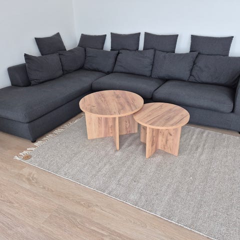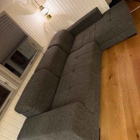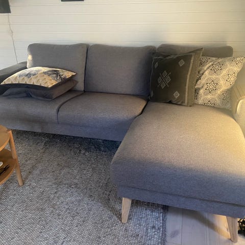 Pæn og velholdt. 4 pudder har fået skiftet fyldet til hårdt skum, så man sidder rigtig godt og ikke synker ned.