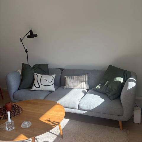 Det er en 3 personers i grå med ben af træ.