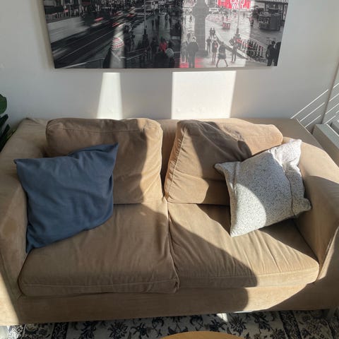 Sofa i ok dårlig stand der er nogle stropper i bunden der holder puderne, der er ved at være godt trætte. Men stadig totalt brugbar. Perfekt til et smækket øvelokale eller lignende. Også derfor den sælges billigt.