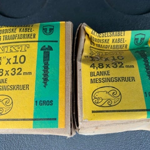 2 pakker NKT blanke messingskruer med rundt hoved og lige kærv: 1 pakke 4,8x 13 mm, og 1 pakke 4,8x32 mm. 1 gros (144 stk) i hver pakke, altså i alt 288 stk. Helt nye og uåbnede pakker. Nypris 485 kr pr. Pakke, i alt 970 kr.