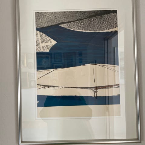 Indrammet abstrakt kunsttryk i grønne, beige og sorte nuancer. Motivet består af geometriske og organiske flader, der overlapper hinanden. Trykket er monteret i hvid passepartout og sølvfarvet ramme. Velegnet til ophængning i stue, kontor eller andre opholdsrum. Kunstnernavn og eventuelle oplysninger om oplag fremgår håndskrevet på værket, men er ikke tydeligt læselige på billederne.