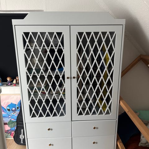 Cam Cam Copenhagen børneskab i hvidt træ med to gitterlåger og nederste skuffer. Skabet har bøjlestang til ophæng af børnetøj samt hyldeplads til opbevaring af tøj, legetøj eller tekstiler. Fronten er udført med dekorative diamantformede udskæringer i lågerne. Egnet til indretning af børneværelse som garderobeskab eller opbevaringsmøbel.