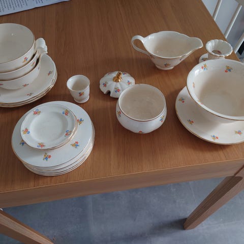 Kaffekande, 2 lysestager, 2 sukkerskåle med låg, flødekande, 6 fine tallerkner, 4 dybe, 6 kopper med underkop, 2 fade, en skål, 9 kagetallerkener. Fin stand, pæne guldkanter.