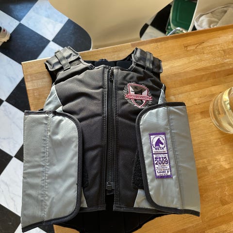 Horze ridevest og ridestøvler i sort. Ridevesten er polstret med justerbare stropper ved skuldre og sider samt lynlås foran. Den har Horze-logo på fronten. Ridestøvlerne er høje, sorte støvler i størrelse 37 med glat overflade og mønstret sål. Sættet er egnet til ridning og anden hesteaktivitet.