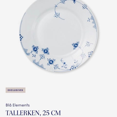 Royal Copenhagen Blå Elements tallerken i porcelæn. Tallerkenen måler 28 cm i diameter og har det karakteristiske blåmalede Blå Elements mønster på hvid bund. Velegnet som middagstallerken eller serveringsfad i stel fra Royal Copenhagen.Nyt