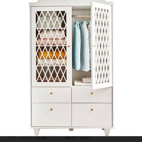 Cam Cam Copenhagen klædeskab til børn i gråmalet træ. Skabet har to låger med gitterfront og fire skuffer nederst. Indvendigt er der hylder og plads til opbevaring af børnetøj eller legetøj. Egnet til brug på børneværelse eller i andre rum, hvor der er behov for ekstra opbevaringsplads.