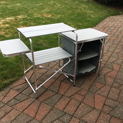 Foldbart camping køkkenbord(120x50x65/80) i bæretaske med opbevaringsskab med stofsider og 2 hylder.