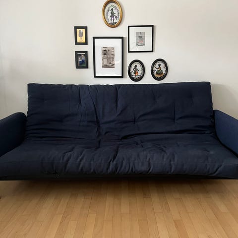 Innovation Living sovesofa i mørkegråt/blåt stof. Sofaen kan foldes ud til seng og har polstret liggeflade med knapdetaljer. Løse ryghynder giver mulighed for at justere siddekomforten. Velegnet som kombineret sofa og gæsteseng i stue, gæsteværelse eller mindre bolig. Ny pris 6.000 kr.