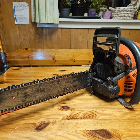 Husqvarna 345 motorsav i orange med kæde monteret. Der medfølger to ekstra Husqvarna-sværd i forskellige længder, som ses på billederne.