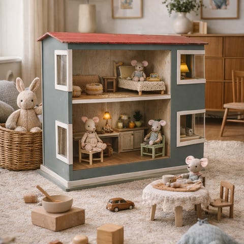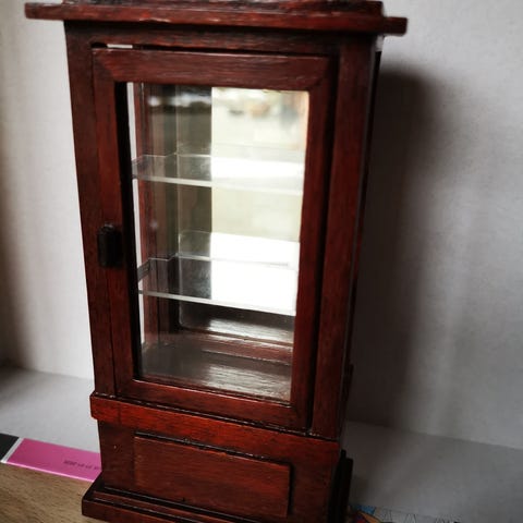 Reutter butiksvindue hvor glasplade kan tages op og det kan sættes hylder ind i rødt træ. Skabet har gennemsigtig front og medfølgende løse hyldersom kan placeres indeni. Velegnet som tilbehør til dukkehus eller som samlerobjekt. Mål kan ses på billedet med tommestok.