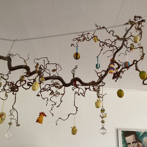 Flotte ny-afskårne krøllede Troldhasselgrene til påskepynt.