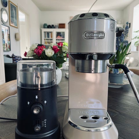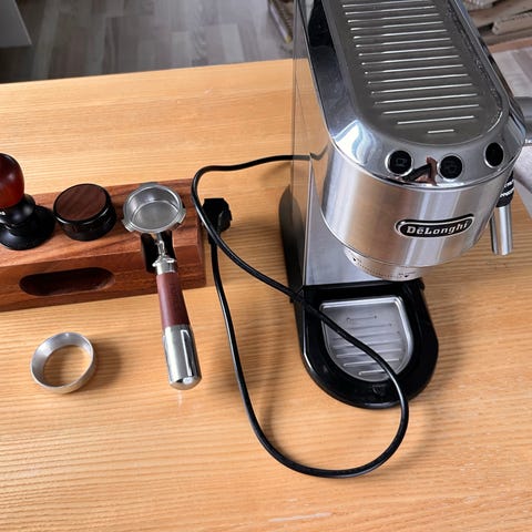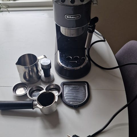 De'Longhi Dedica espressomaskine i sort/grå metalfinish. Maskinen er en kompakt halvautomatisk espressomaskine med aftagelig vandtank på bagsiden og drypbakke i rustfrit stål. Medfølgende tilbehør omfatter portafilter, filterkurve og brugervejledning, som ses på billederne. Velegnet til brygning af espresso og tilberedning af mælkedrikke via den indbyggede dampskummer.