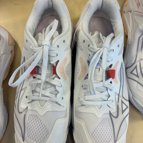 Mizuno sportssko i størrelse 37. Modellen er i hvid med enkelte kontrastdetaljer. Overdelen er i syntetisk materiale med meshfelter for åndbarhed, og skoene har snørelukning. Ydersålen er mønstret for godt fodfæste på indendørs underlag. Velegnet som trænings- eller sportssko.