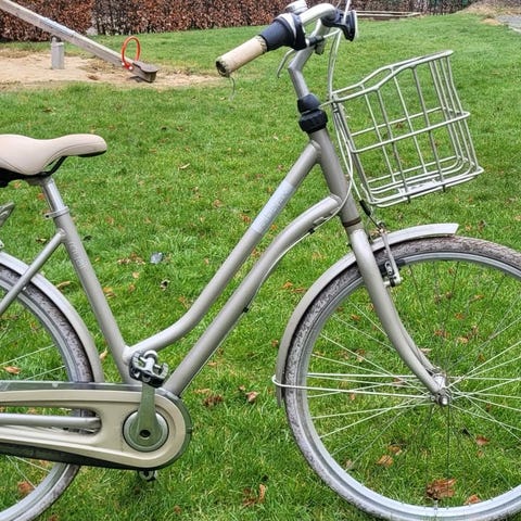 En grøn damecykel. Den kører stadig rigtig godt og er i god stand trods alderen. Der medfølger cykellås.