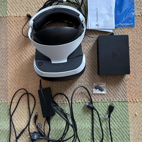 Sony Playstation VR2 VR-headset i hvid med tilhørende VR-controller-sæt og opladerstation. Headsettet tilsluttes med kabel og har justerbar rem og polstret hovedbøjle. Controllers leveres i matchende hvidt design og kan placeres i den medfølgende opladerstation, som tilsluttes via kabel. Velegnet til brug sammen med kompatibel Playstation-konsol til virtual reality-spil og -oplevelser.