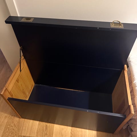 Brugt både som TV møbel (deraf hul i kisten til stik) samt opbevaring gennem mange år.