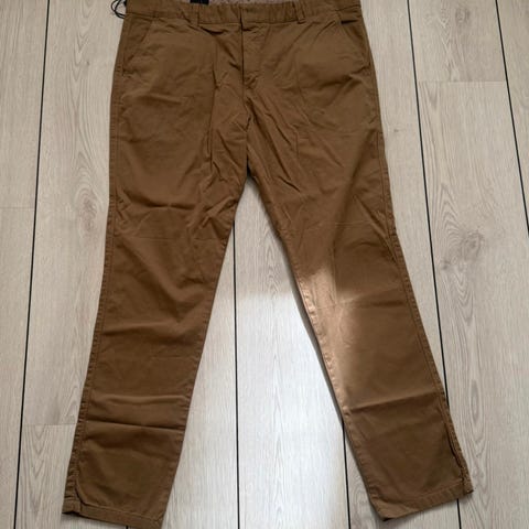 Klassisk model med bæltestropper, sidelommer foran og paspolerede lommer bagpå. Velegnet til hverdagsbrug eller mere pæne anledninger.