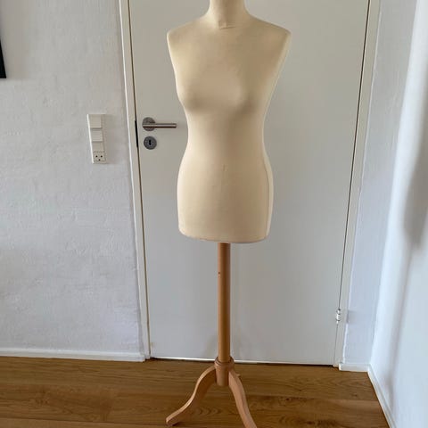 Dame giner i neutral beige farve med træfod. Kroppen er polstret og overtrukket med stof.