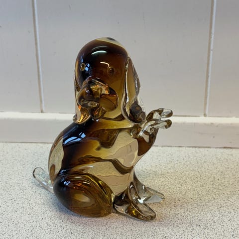 Massivt kunstglas-papirvægt formet som et æg, der er håndblæst med gule og hvide spiraler indeni.