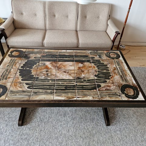 Kvadratisk sofabord med kakler. Står pænt alder taget I betragtning. Sofabordet er mærket H.M sofaborde.