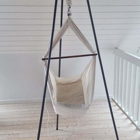 Slyngevugge i god stand, madras kun brugt af 1 barn. Inkl. stativ og motor, samt originalt karmbeslag. Fra røg- og dyrefrit hjem.