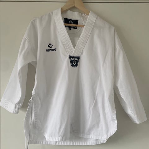 På jakken er der påsyet et DABS (Dansk Budo Sammenslutning) mærke.