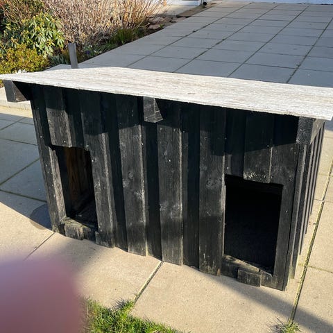 Træ hundehus med skråt tag i sort og beige. Huset er bygget i træ med plader på siderne og et kraftigt tag med overhæng. Indgangen er åben på den ene side, og der er trægulv indvendigt med isolering mod jord. Egnet som læskur eller hundehus i haven for mellemstore hunde. Mål L*B*H er 150*95*135