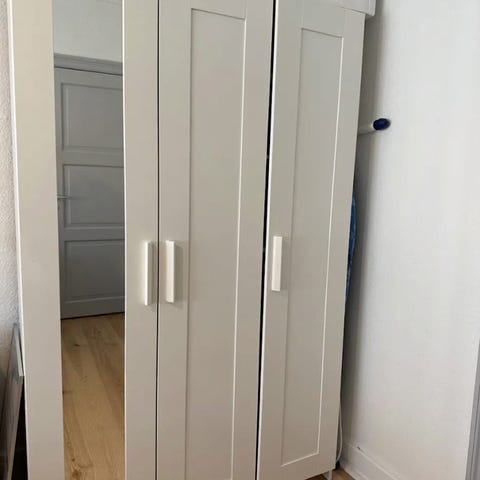 Sort IKEA Brimnes garderobeskab med 3 døre, hvor den ene har spejl. Levering er ikke muligt og skal hentes på 2. Sal. Skabet skal desuden skilles af.