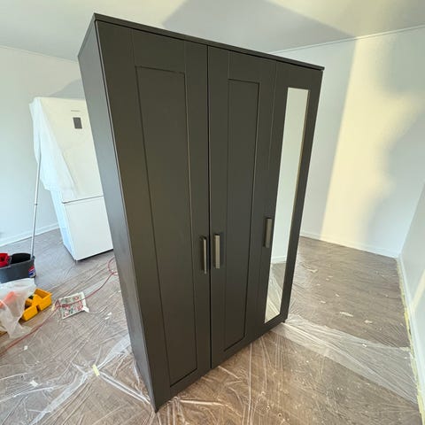 Stand: Brugt med synlige brugsspor — se billeder. Højre dør kan lukkes, men skal justeres for at lukke helt korrekt. Ellers er skabet fuldt funktionelt. Prisen er sat derefter.