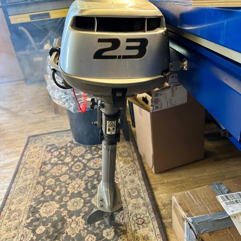 Påhængsmotor til båd i grå farve. Motoren er en benzin påhængsmotor med rorpind til styring og indbygget tank i toppen. Der medfølger gas- og gearhåndtag på rorpinden samt sikkerhedssnor. Velegnet som fremdriftsmotor til mindre både, joller eller som reserve-/hjælpemotor på større både.