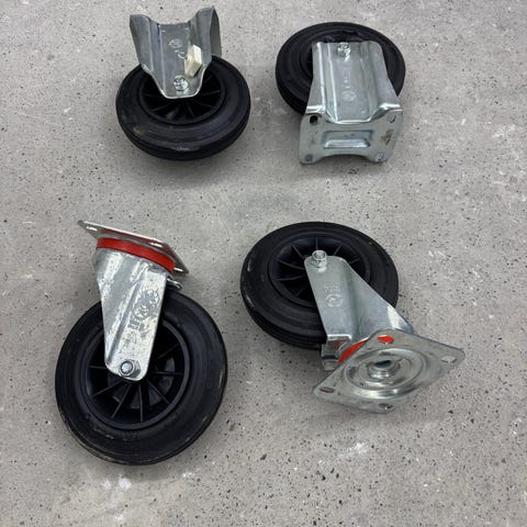 Sættet består af fire svingbare hjul med pladebeslag til montering. Hjulene har dæk i sort gummi med størrelsen 160/40-80, monteret på fælg med eger og galvaniseret stålbeslag. Egnede som transporthjul til f.eks. vogne, borde eller andre konstruktioner, hvor der er brug for mobilitet og fast montering via skruehuller i pladen.