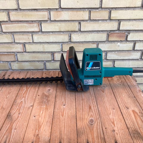 Hækkeklipper på el (220 V). Black & Decker. Sværd 60-65 cm. 500 W. Vejer kun 2,9 kg (hvilket er lettere end de fleste på AKU). Sælges kun fordi mine forældre er blevet for gamle til at klippe hæk. Fungerer fint.