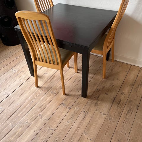Træ spisebord i mørkbrun finish. Bordet er udført i massivt træ med udskårne detaljer på benene og en rektangulær bordplade. Bordet fungerer som udtræksbord med mulighed for forlængelse, så der kan skabes ekstra plads efter behov. Egnet som spisebord i køkken eller spisestue.