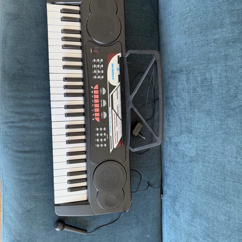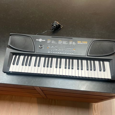 ProfiMusic MK-3000 keyboard med indbyggede højttalere og display. Tangentbordet har forskellige lyde, rytmer og demo-sange, som kan vælges via kontrolpanelet. Tangenter med lys i. Der medfølger hovedtelefoner, mikrofon og strømforsyning, så instrumentet kan bruges både til øvning med lyd ud gennem højttalere eller mere lydsvagt med høretelefoner.