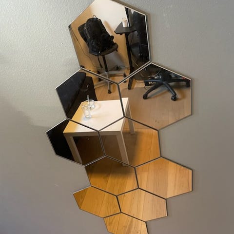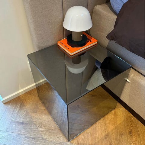 IKEA spejlbord med sekskantet topplade. Bordet har spejlpaneler på siderne og en glad bordplade i sekskantet form med mørke kanter. Egnet som lille sidebord, pyntebord eller natbord i stue, soveværelse eller entré. Designet giver både opbevaringsflade og spejleffekt, som kan lysne rummet.