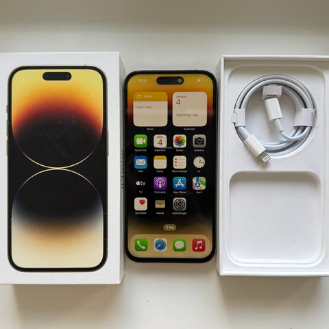 Iphone 14 Pro i sort 128gb i god stand og batteriet er på 100% der den lige er blivet skiftet inkl opladerkabel og cover.
