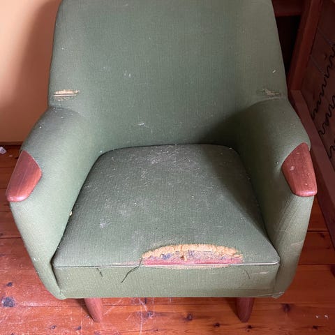 Slidt retro lænestol med høj ryg, ben og ‘negle’ af teaktræ, jeg har den manglende negl. Samme slags stol, som en anden jeg har til salg, men denne har høj ryg.