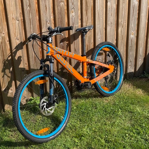 Principia Evoke børnecykel med 24" hjul. Udstyret med forgaffel med affjedring og mountainbike-dæk, som egner sig til både hverdag og lettere terrænkørsel.