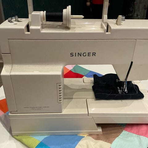Singer Start symaskine i hvid. Symaskinen er velegnet til grundlæggende syning og simple syopgaver i hjemmet. Modellen har flere standardsting og justerbare indstillinger, som gør den egnet til reparationer, oplægning af tøj og mindre syprojekter. Leveres i original emballage som vist på billedet.