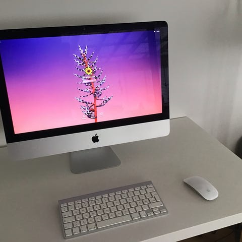 Apple iMac stationær computer i hvid/sølv med indbygget skærm. Enheden har integreret stander og leveres med Apple tastatur og tilslutningskabel, som ses på billedet. Velegnet til almindeligt kontorbrug.