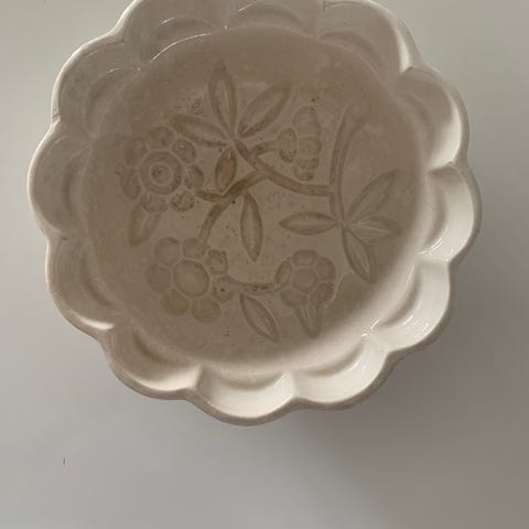 Smuk vintage fajancebuddingeskål, af tysk oprindelse fra DDR-tiden, karakteriseret ved sin cremefarve, bølgede kant og dekorative blomsterrelief i bunden.