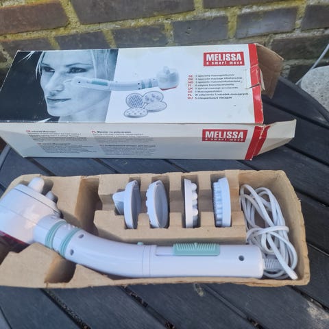 Massage infrarød massageapparat til kropsmassage. Apparatet er elektrisk og håndholdt og leveres med flere udskiftelige massagehoveder til forskellige typer massage. Anvendes til lokal massage af fx nakke, skuldre, ryg og ben. Farverne er primært hvid med røde detaljer. Velegnet til hjemmebrug som personligt plejeprodukt.