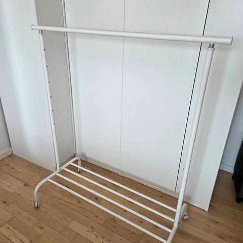 Stativet har en bøjlestang øverst til ophæng af tøj samt to praktiske hylder nederst til sko, tasker eller opbevaring.