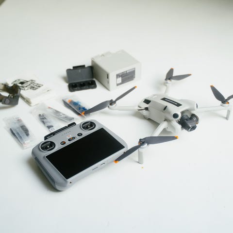 Sættet omfatter DJI RC controller og Fly More kit bestående af komplet propel sæt stadig i original emballage, tre batterier, oplader, ladekabel og beskyttelsesdæksel til DJI Mini 3 Pro dronens kamera.