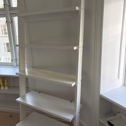 IKEA reol i hvid 2 stk. Smal, høj model med flere justerbare hylder, egnet til opbevaring af fx bøger, film eller dekoration. Reolerne er velegnet til rum med begrænset plads eller som ekstra opbevaring langs en væg.