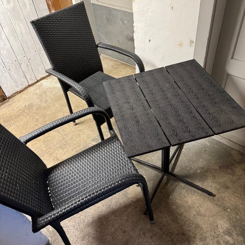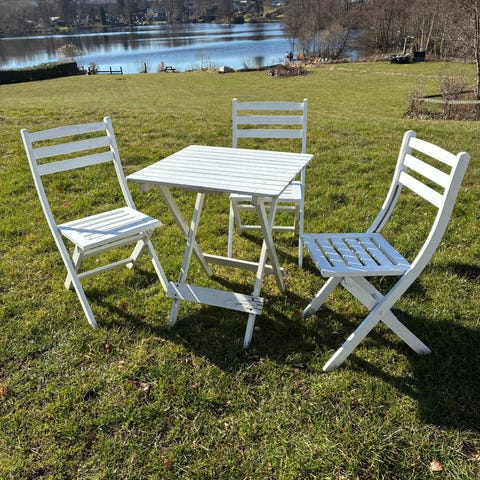 Havebordsæt/cafésæt i træ og hvidmalet. Sættet består af et firkantet bord (60 x 60 cm. og 70 cm. højt) og tre tilhørende klapstole i samme stil. Både bord og stole er sammenklappelige, så de er nemme at opbevare, når de ikke er i brug. Overfladen har afskalninger som følge af udendørs brug. Sættet er flot på terrassen eller på skyggepletten i haven - eller på den lille altan, hvor der er behov for et kompakt cafésæt.