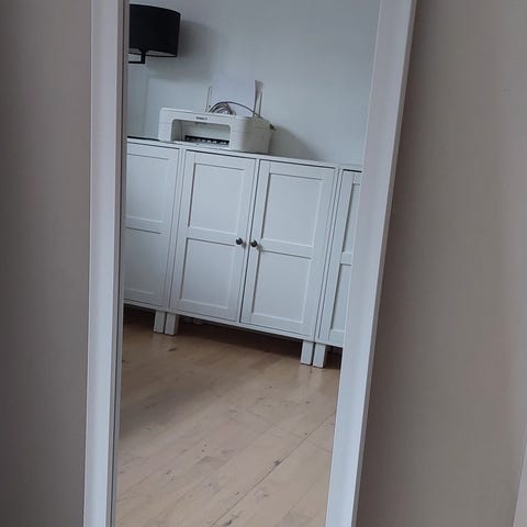 Hvid ramme, hvidt, måler 127x35 cm. Kan væghænges både vandret og lodret. Eller stilles på gulvet. Nypris 140 kr.