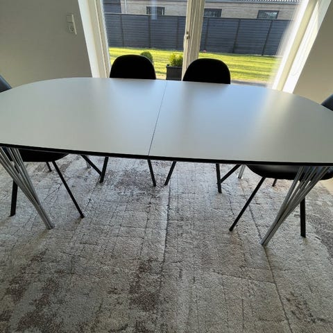 Spisebord 1 x 2 m, 2 ekstra plader som ligger under bordpladen. Med plader 1 x 3 m.