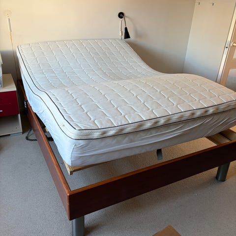 Sælger min elevationsseng, da jeg har tilkøbt en ny. Sengen måler 140x200 og som billederne viser, kan den køre elektronisk op foran og bagved.